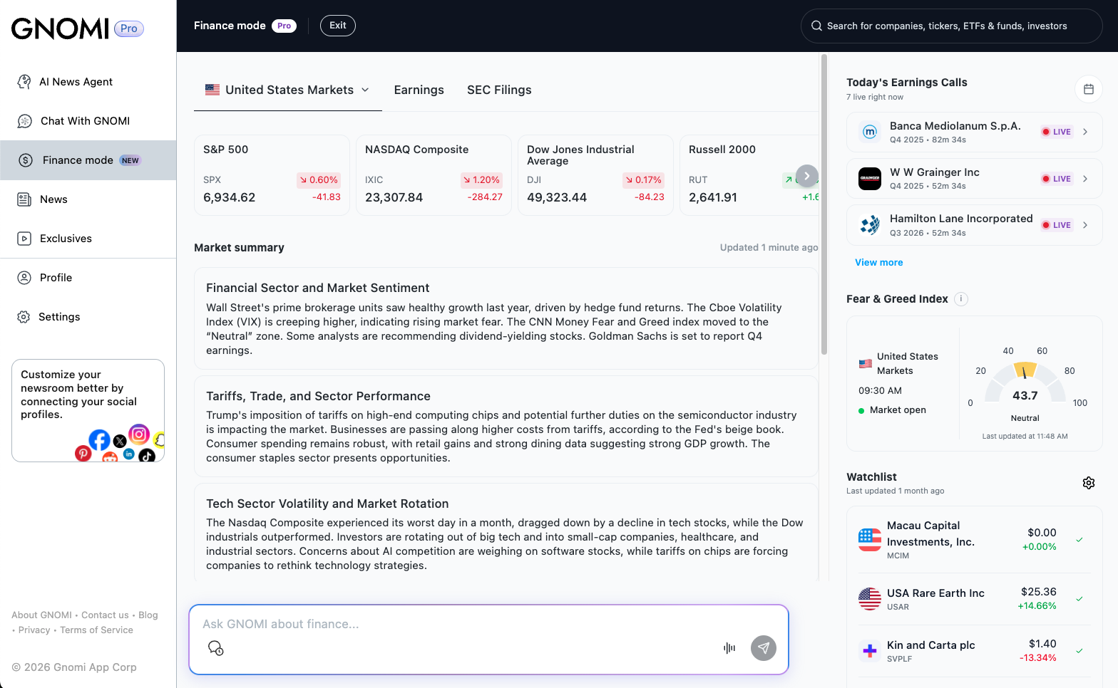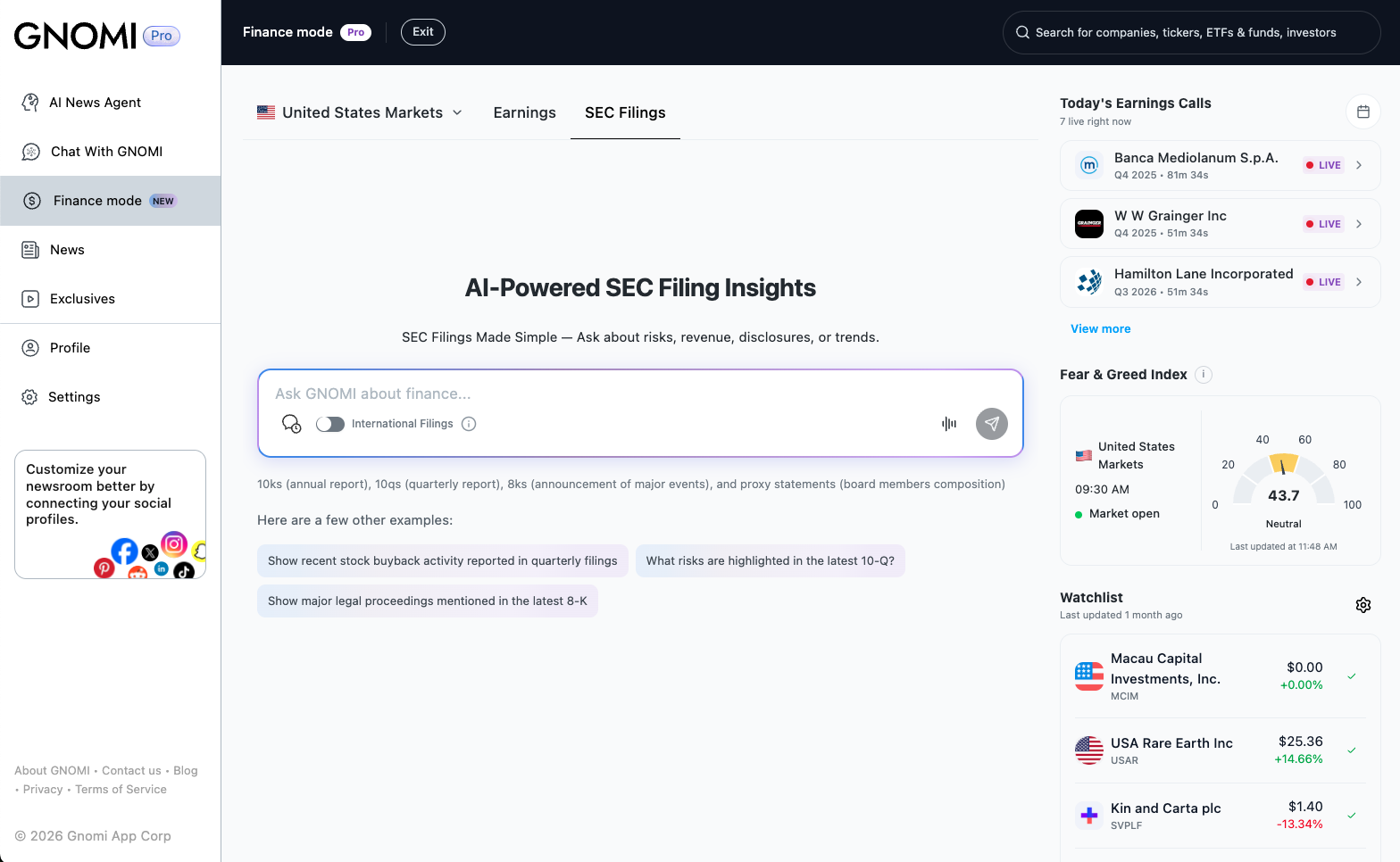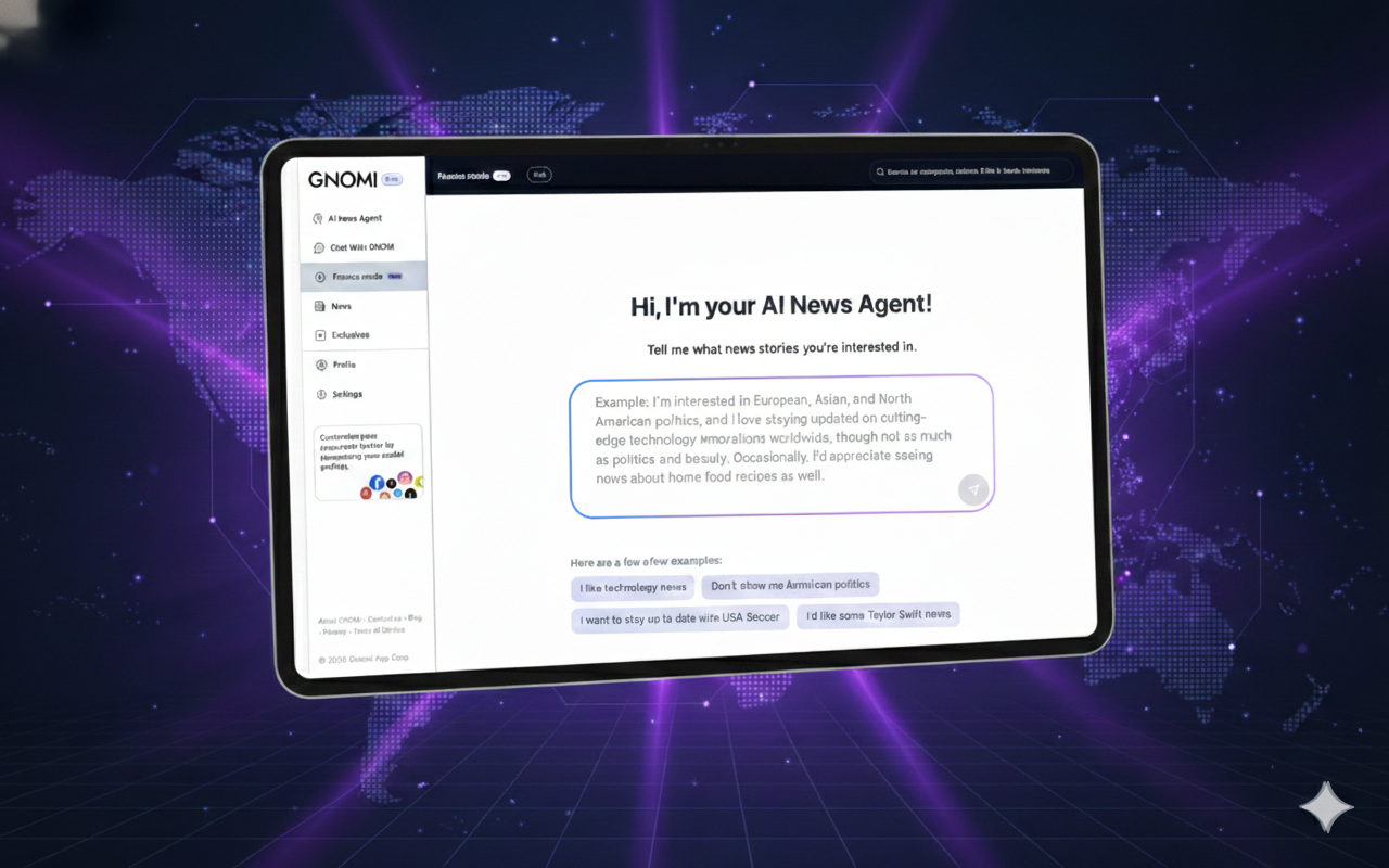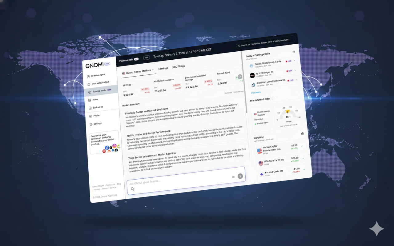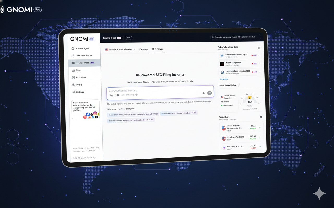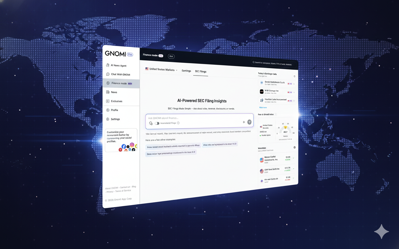 Gnomi is an AI-powered real-time news agent that continuously monitors global information from more than 180 countries and turns it into clear, contextual understanding. The product offers tiered plans (Basic, Premium, Pro) with unlimited chat prompts, LLM switching (e.g. Gemini, GPT, Claude), and social and subscription connections. GNOMI Pro adds Finance Mode: live market data and AI analysis, SEC filing summaries, live earnings call transcripts with key takeaways, watchlists, earnings calendars, and an AI-powered newsletter tailored to schedule, interests, and industry. The experience is available on web and via iOS and Android apps.