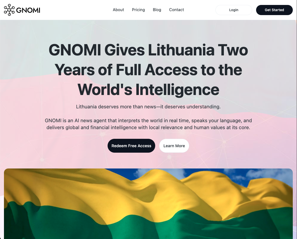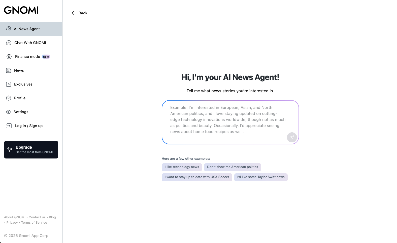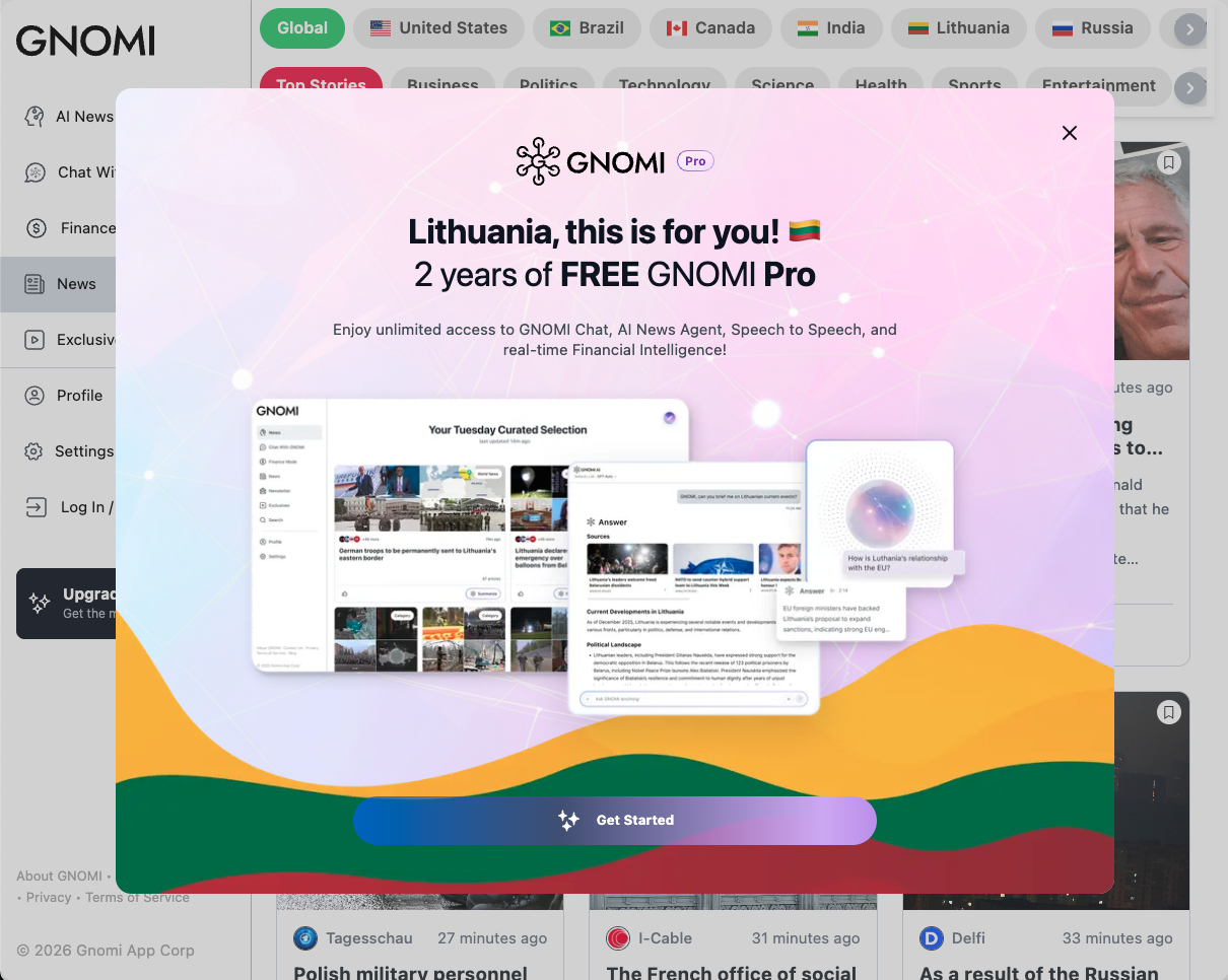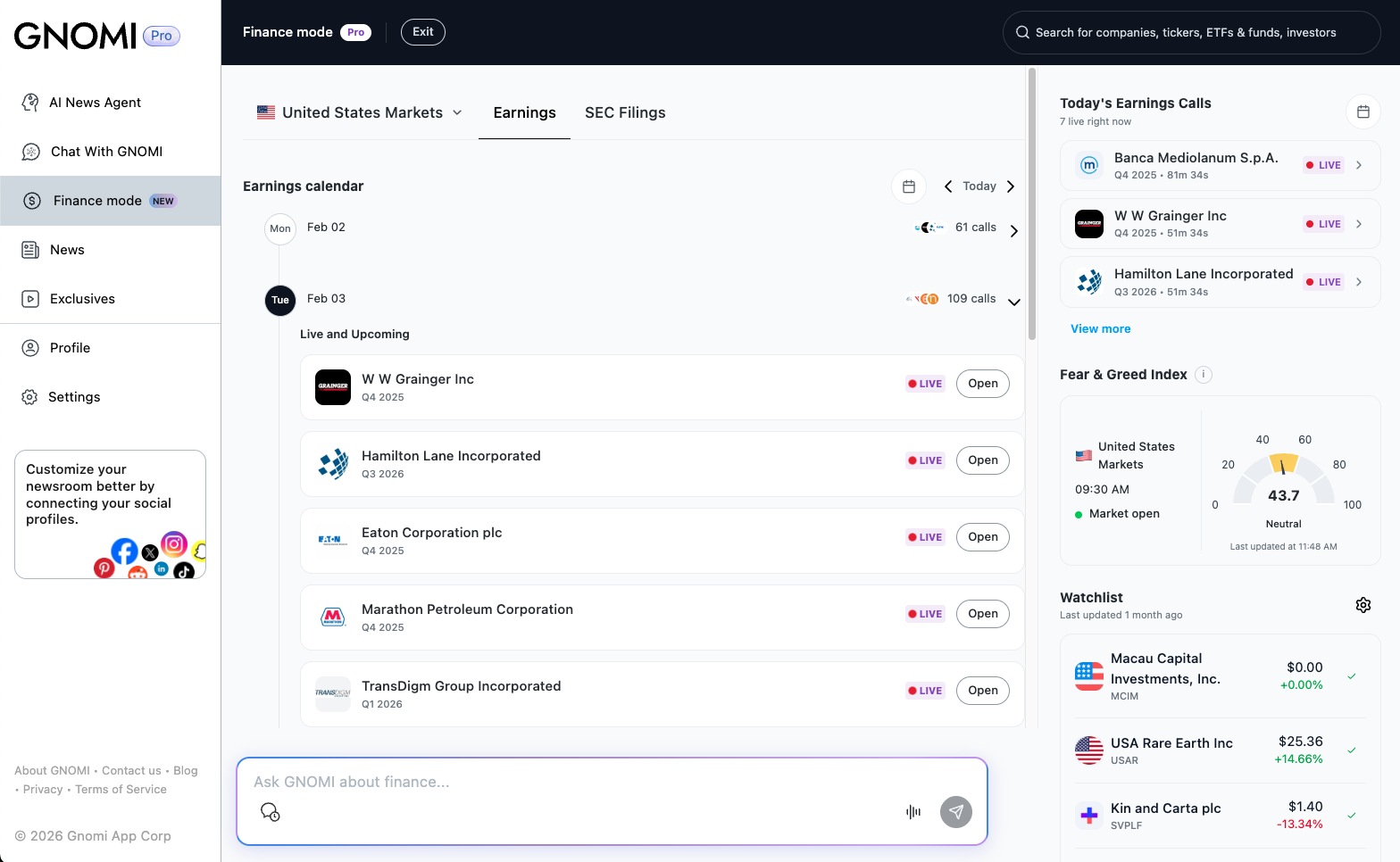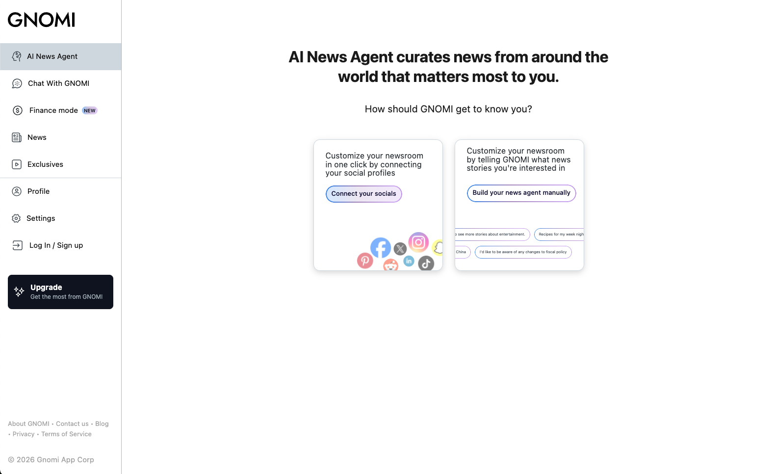 Gnomi is an AI-powered real-time news agent that continuously monitors global information from more than 180 countries and turns it into clear, contextual understanding. The product offers tiered plans (Basic, Premium, Pro) with unlimited chat prompts, LLM switching (e.g. Gemini, GPT, Claude), and social and subscription connections. GNOMI Pro adds Finance Mode: live market data and AI analysis, SEC filing summaries, live earnings call transcripts with key takeaways, watchlists, earnings calendars, and an AI-powered newsletter tailored to schedule, interests, and industry. The experience is available on web and via iOS and Android apps.