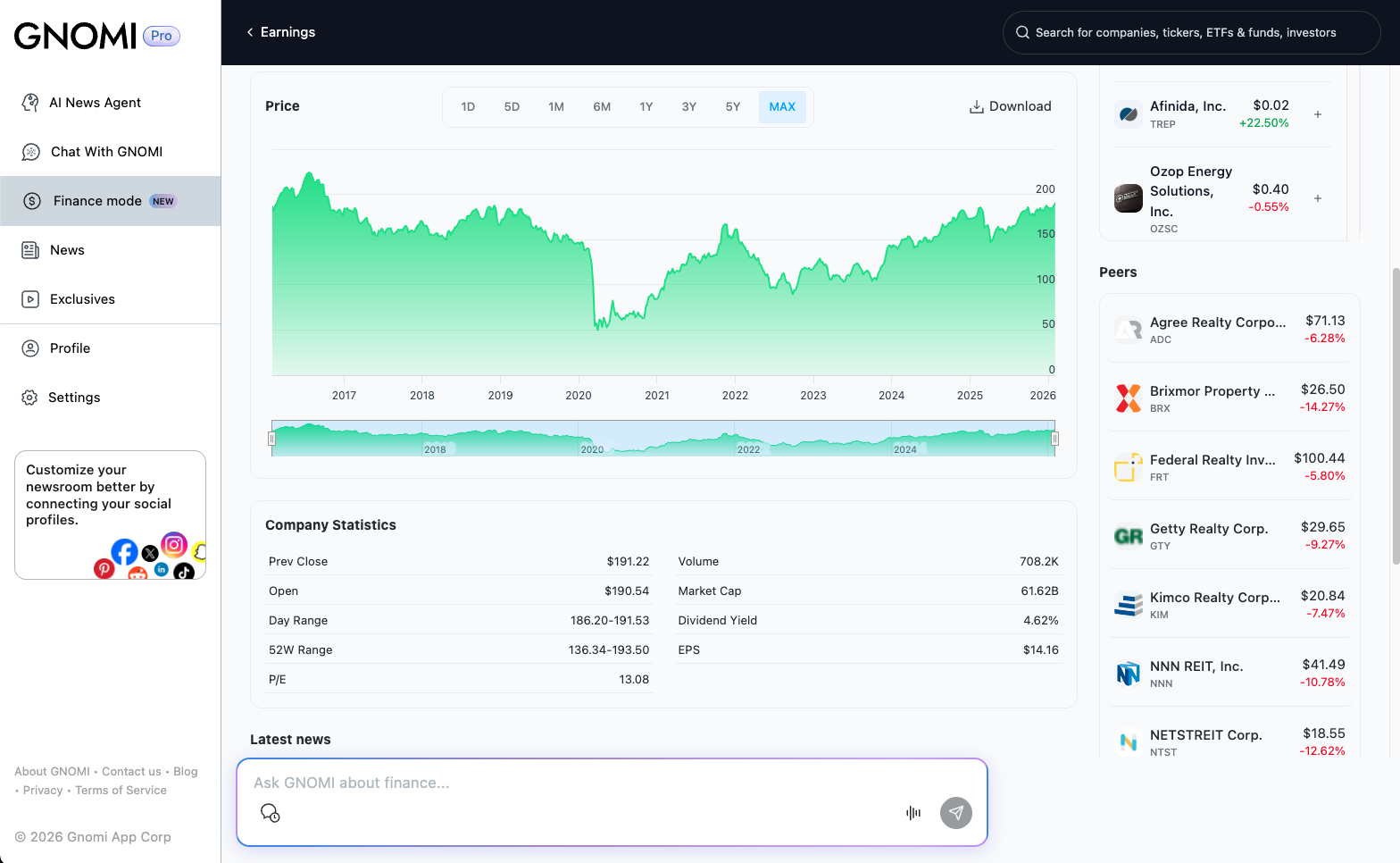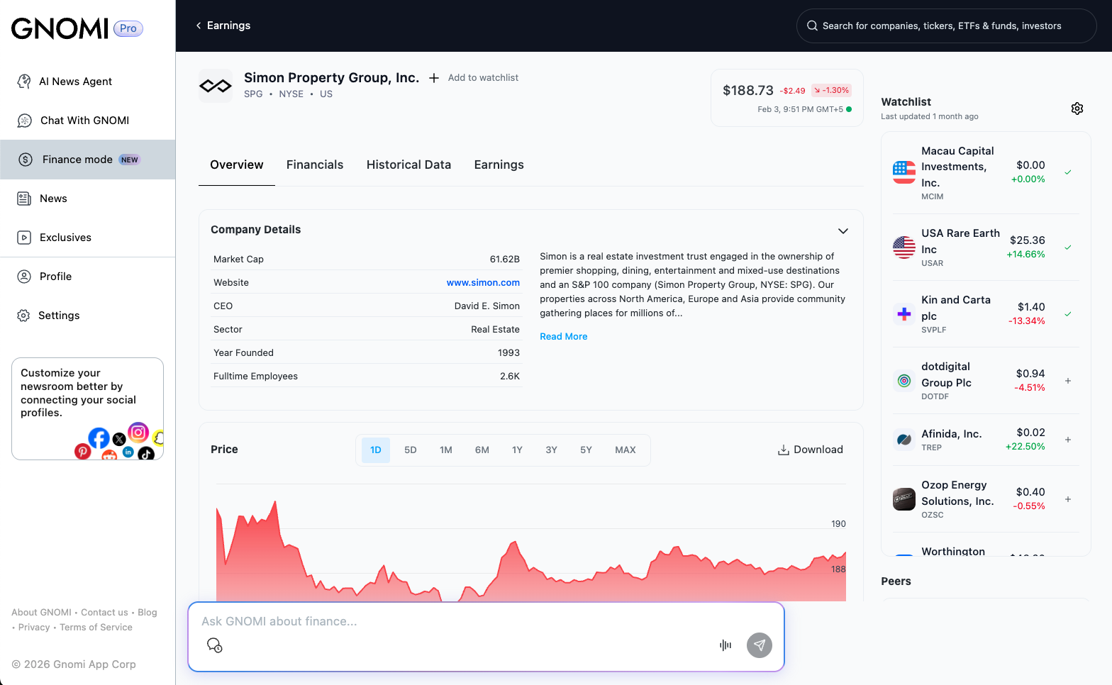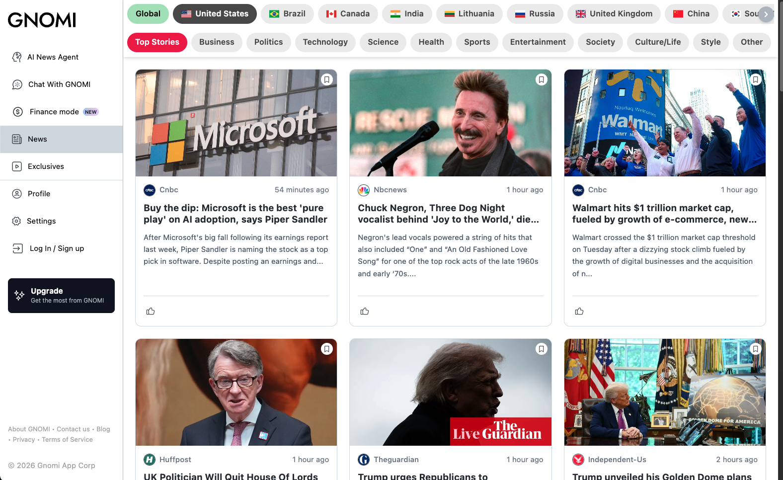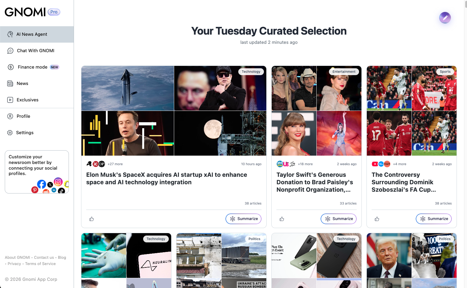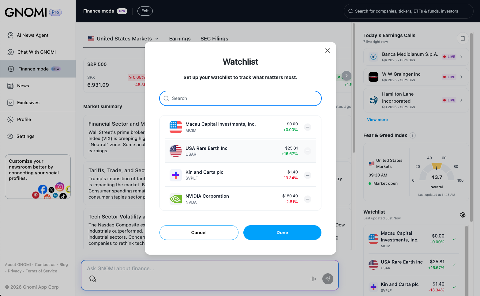 Gnomi is an AI-powered real-time news agent that continuously monitors global information from more than 180 countries and turns it into clear, contextual understanding. The product offers tiered plans (Basic, Premium, Pro) with unlimited chat prompts, LLM switching (e.g. Gemini, GPT, Claude), and social and subscription connections. GNOMI Pro adds Finance Mode: live market data and AI analysis, SEC filing summaries, live earnings call transcripts with key takeaways, watchlists, earnings calendars, and an AI-powered newsletter tailored to schedule, interests, and industry. The experience is available on web and via iOS and Android apps.