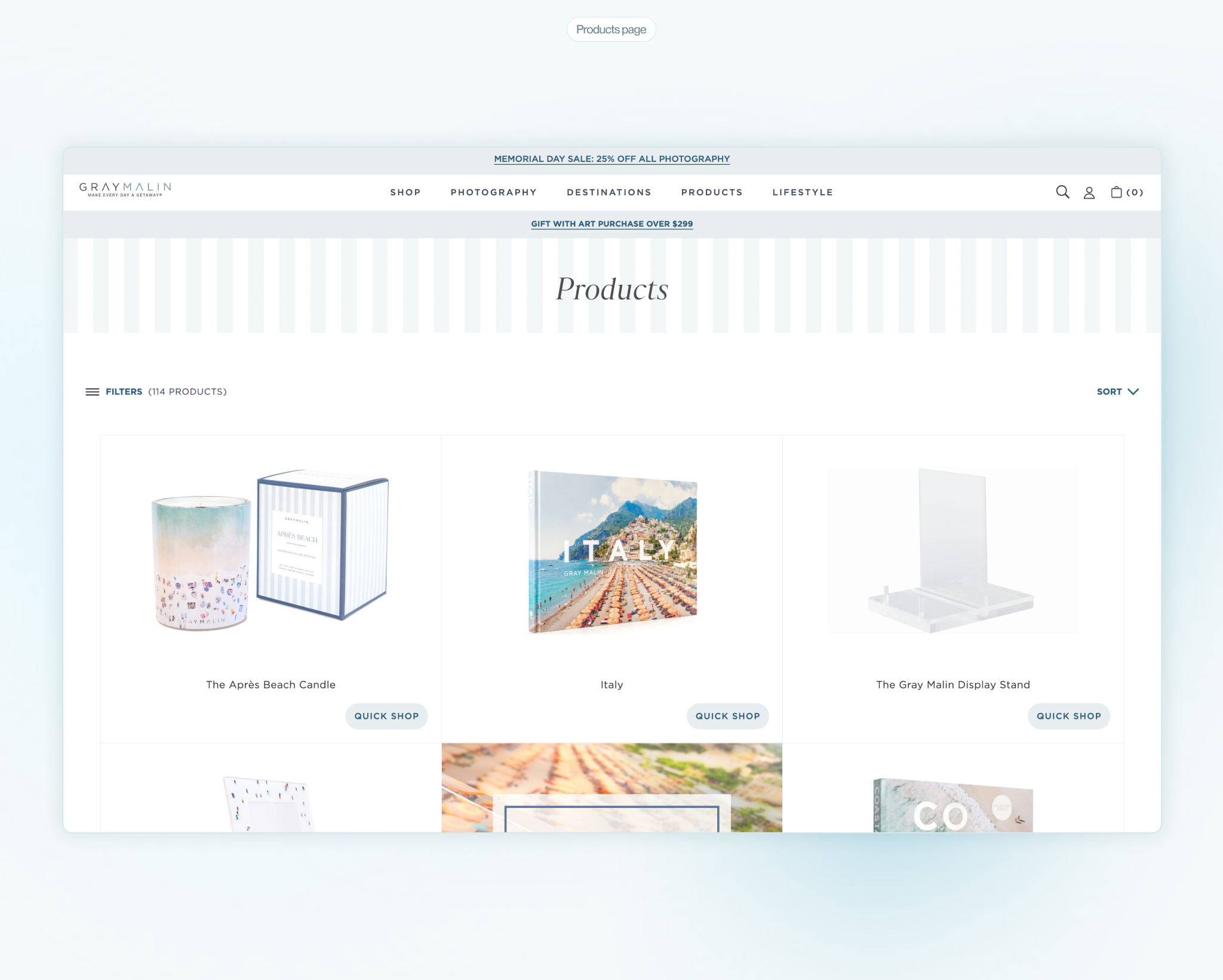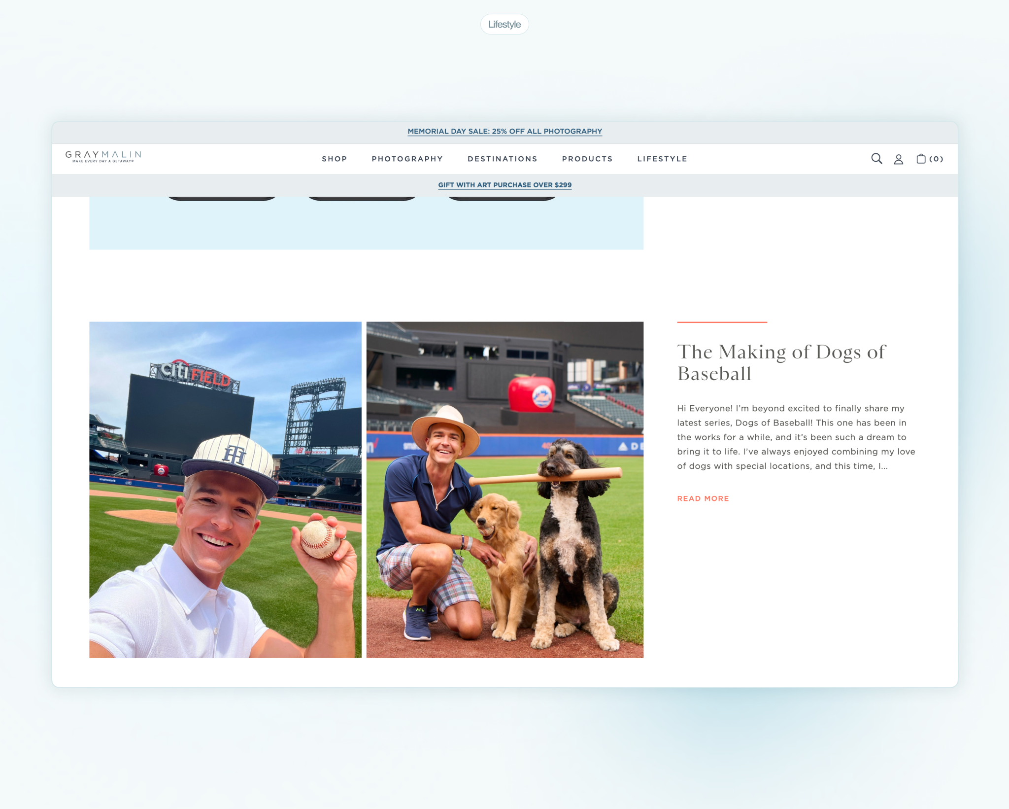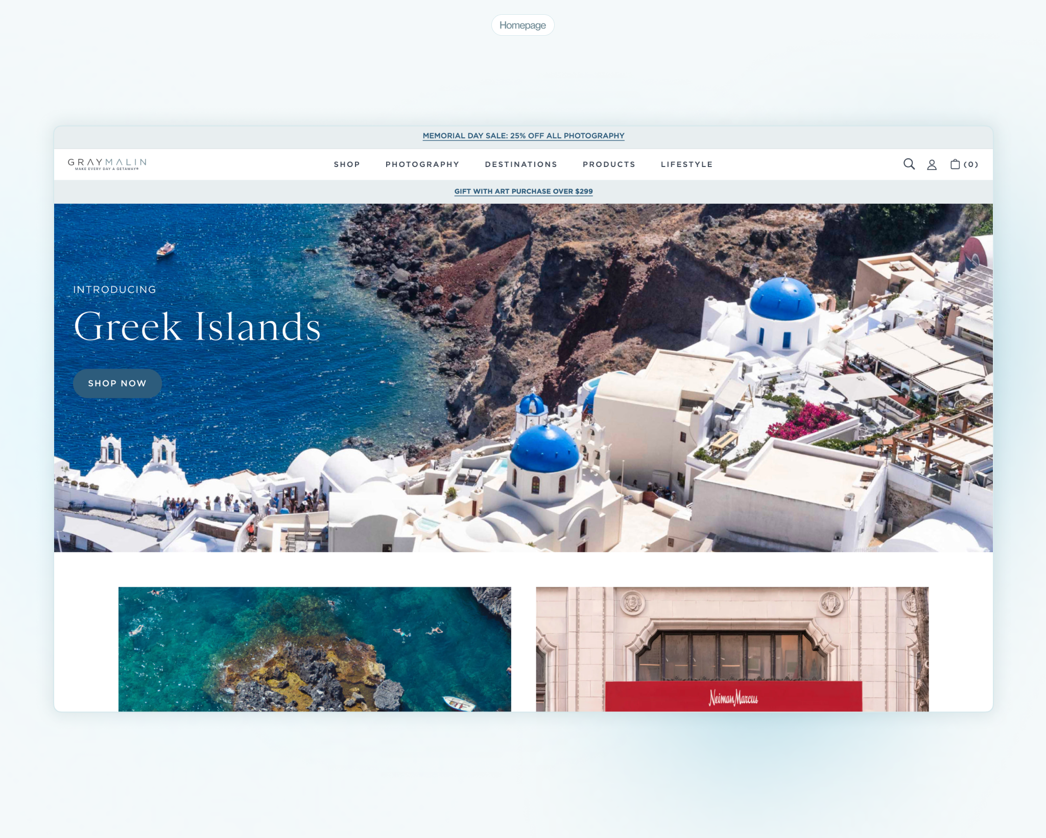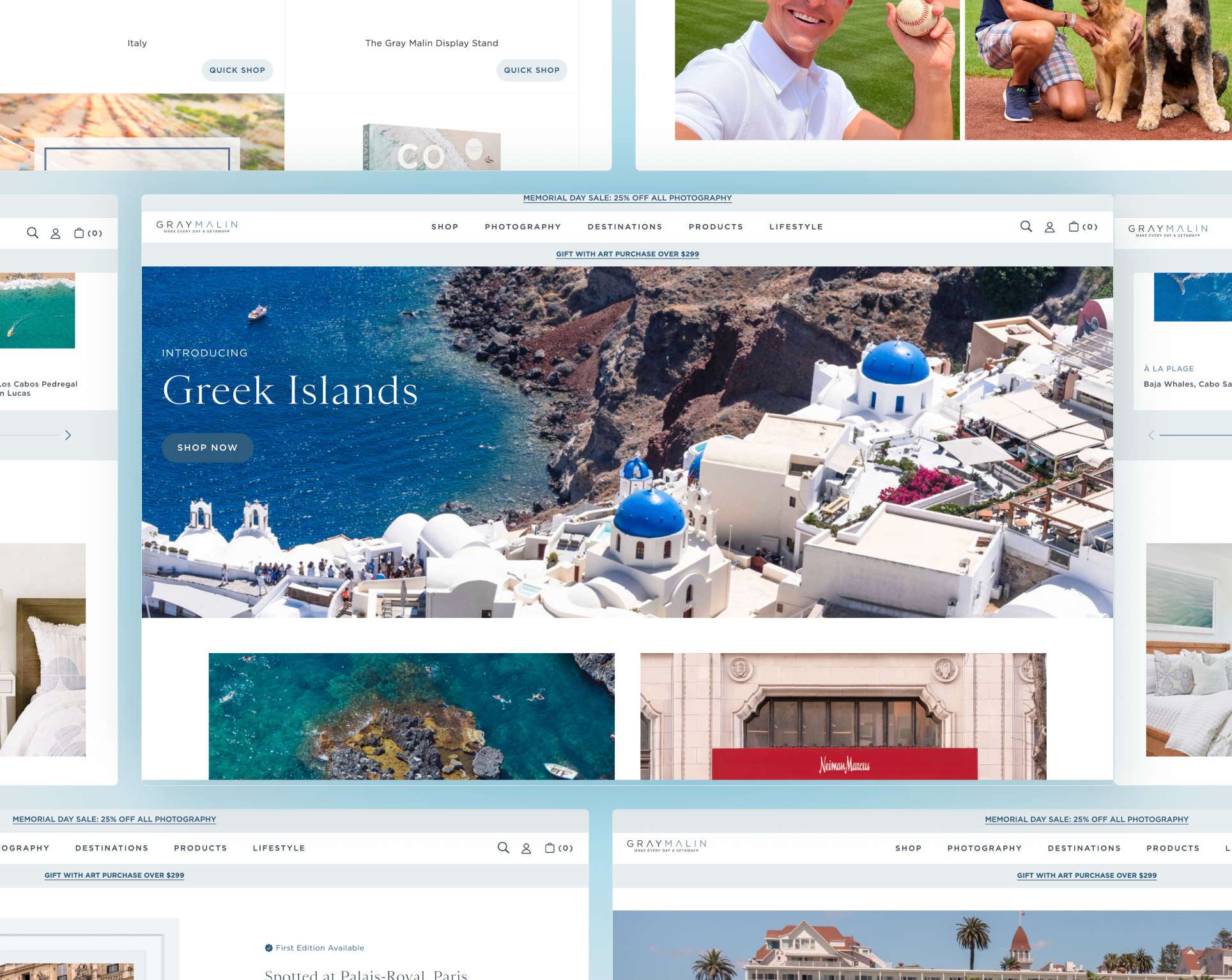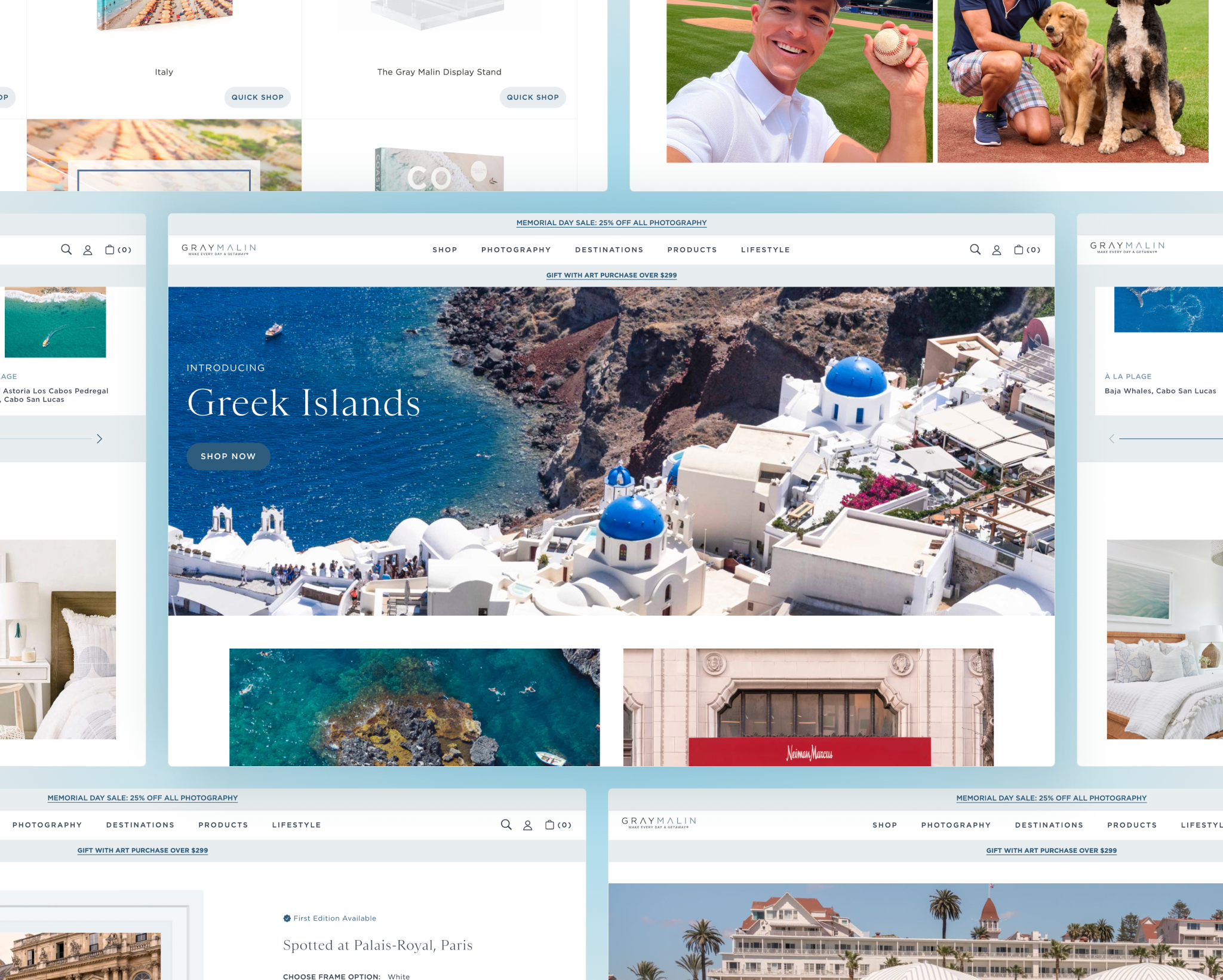Full-stack work on Gray Malin's Shopify site: CMS integration, SEO, and performance improvements that boosted search rankings and LightSpeed scores.
