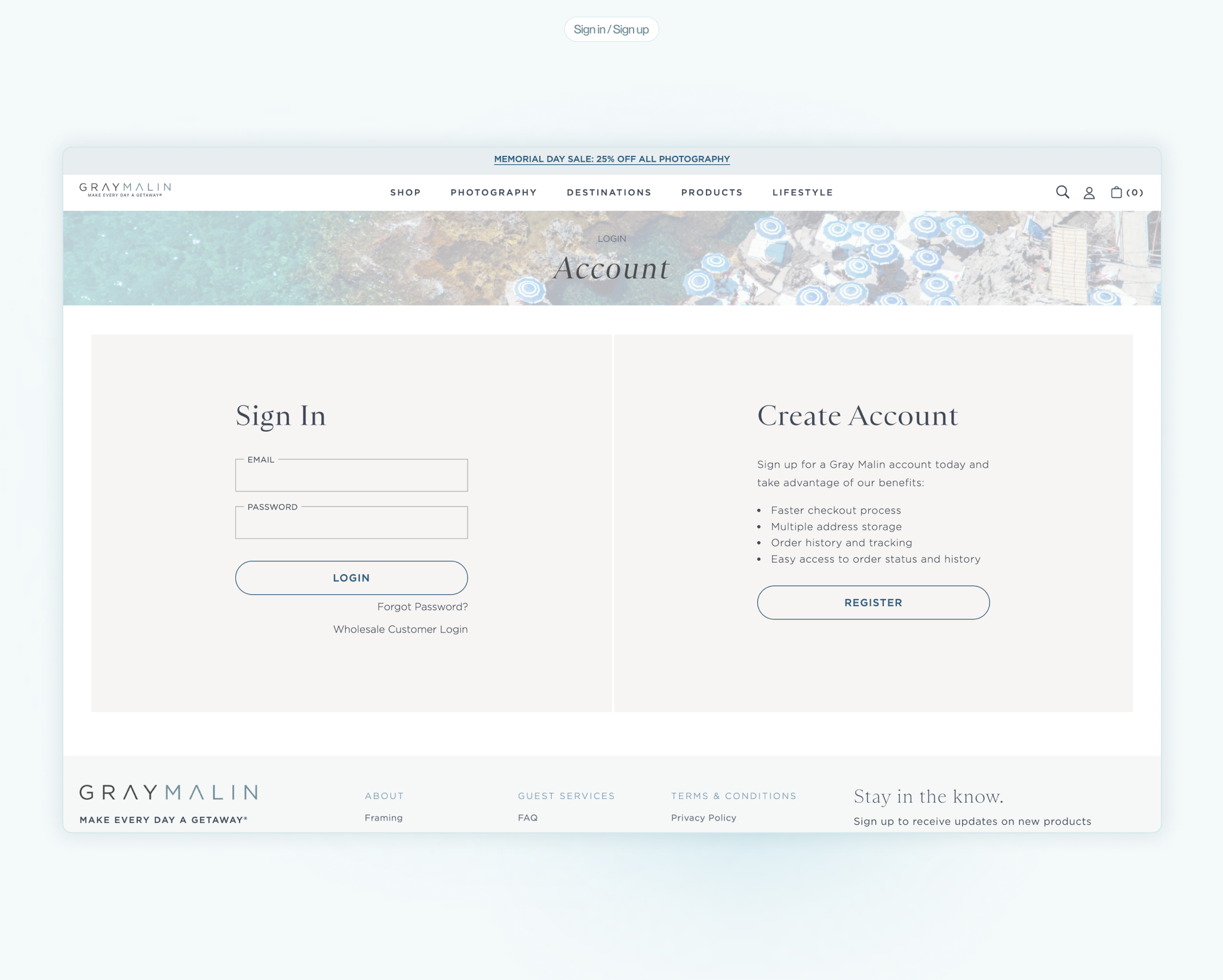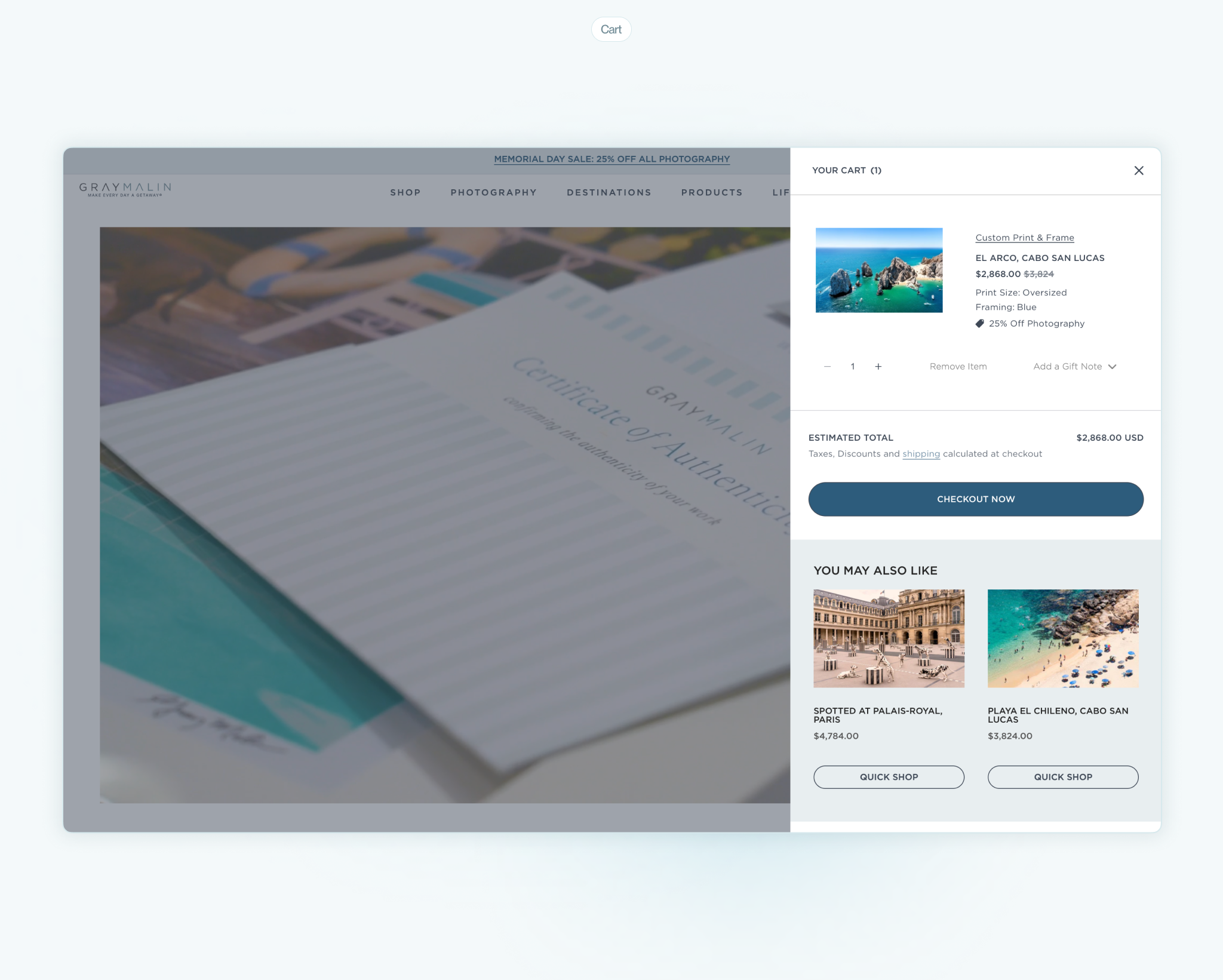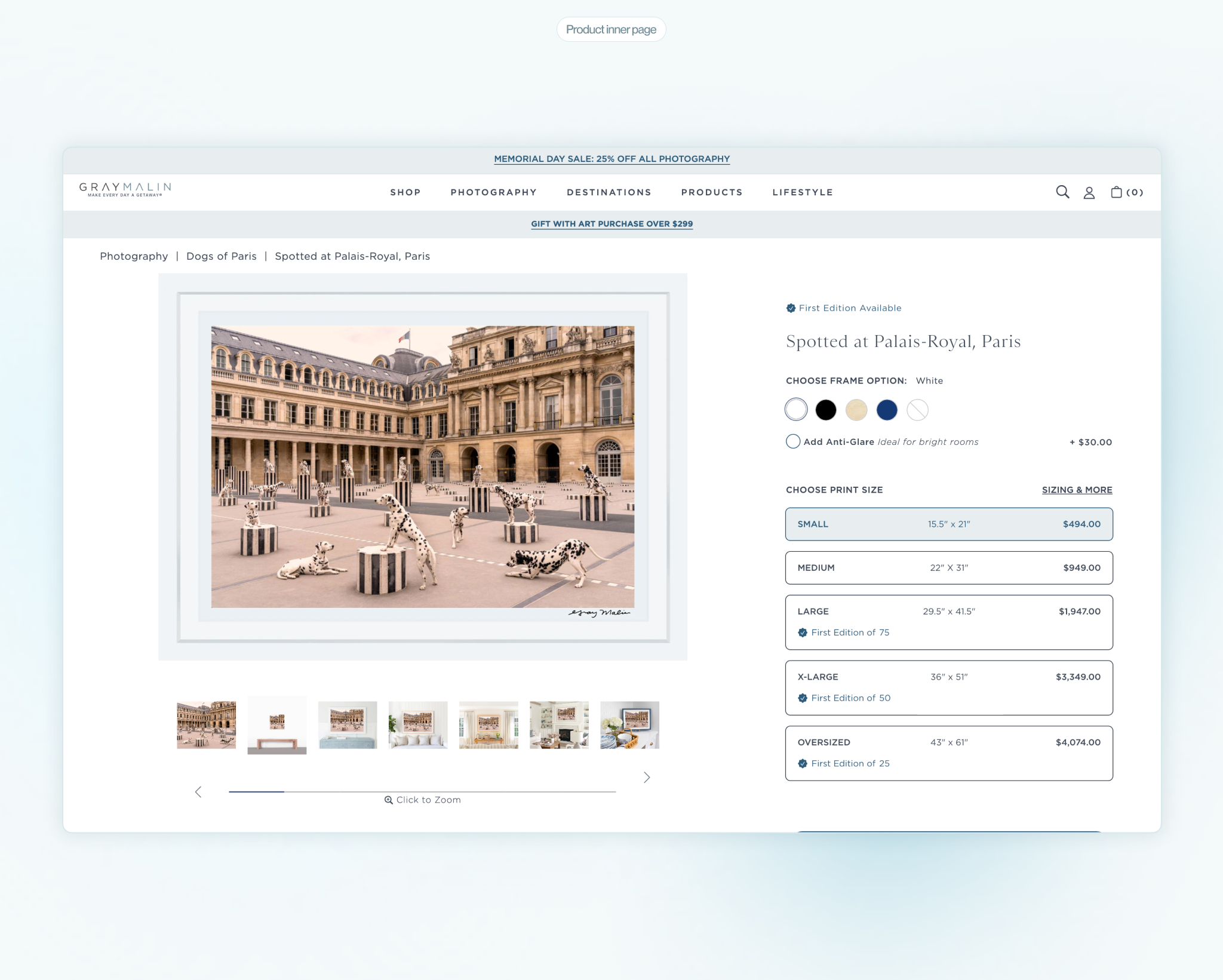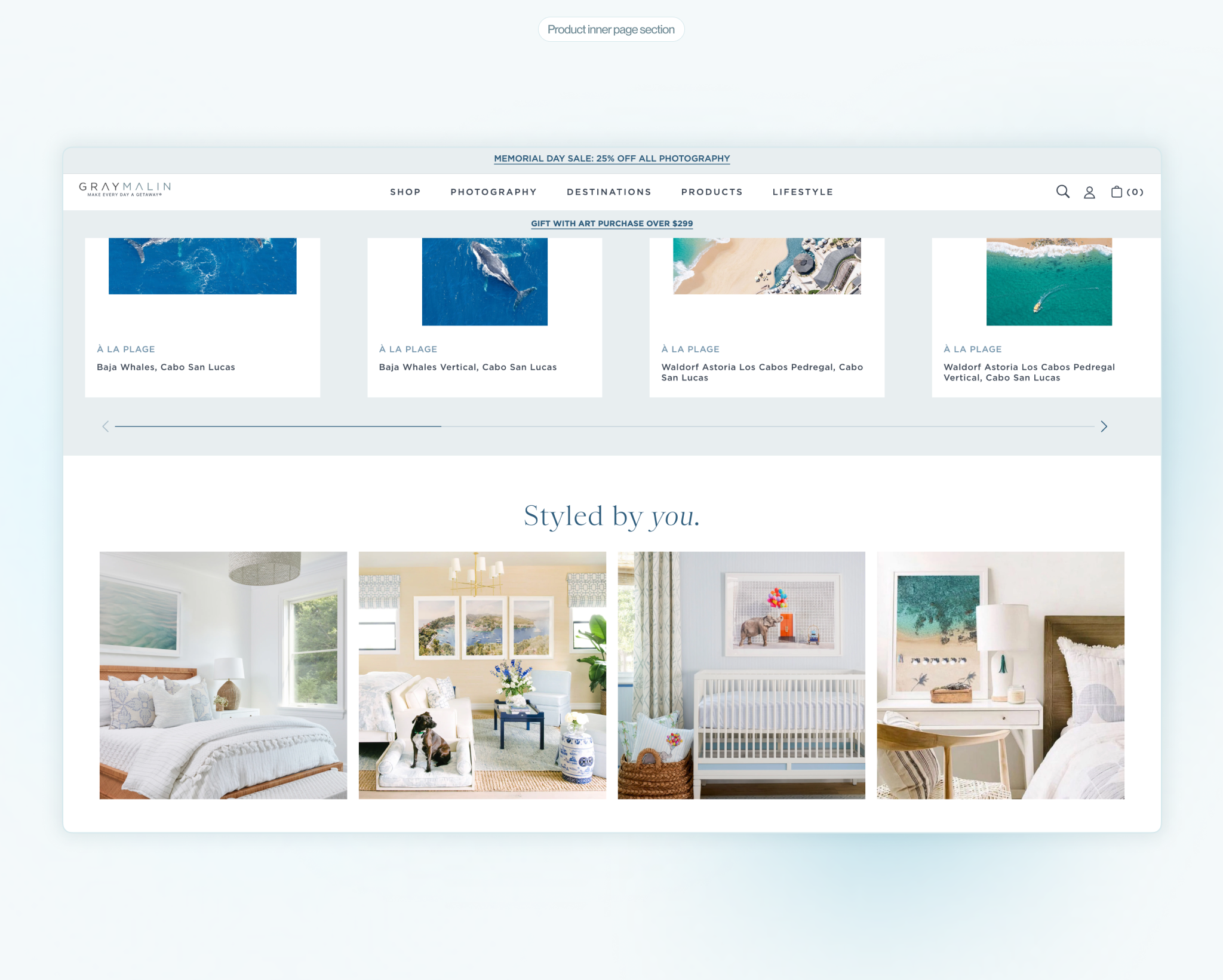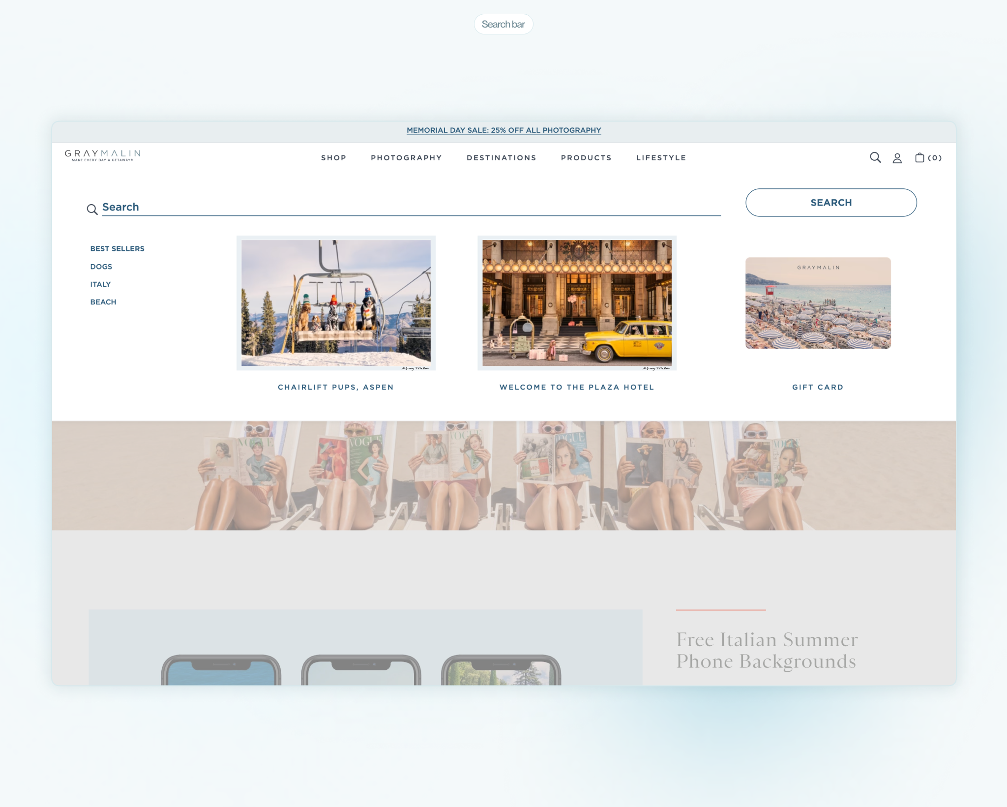 Full-stack work on Gray Malin's Shopify site: CMS integration, SEO, and performance improvements that boosted search rankings and LightSpeed scores.